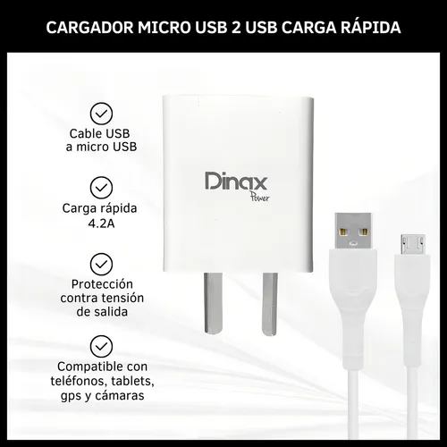 Carga eficiente y segura para todos tus dispositivos. Este cargador de pared cuenta con dos puertos USB y una potencia total de 4.2 amperios, ideal para recargar rápidamente hasta dos dispositivos al mismo tiempo.