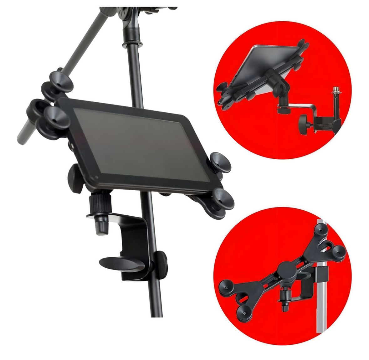 Soporte universal para dispositivos móviles de hasta 11", compatible con Apple, Samsung, LG, Motorola, Xiaomi y más. Cuenta con sistema de anclaje ajustable para pies de micrófono o trípodes (diámetro de 14 a 25 mm), ideal para músicos, podcasters y creadores de contenido.