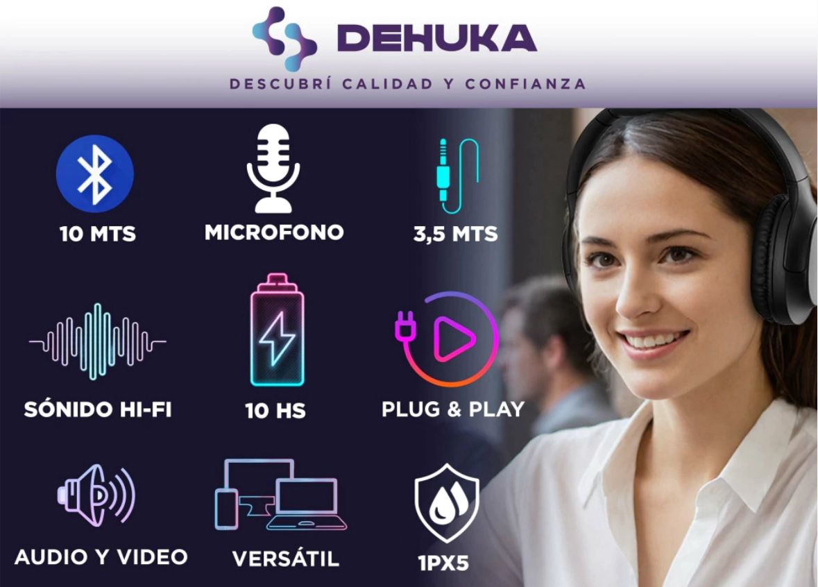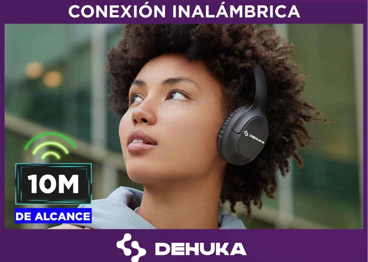 os auriculares Dehuka ofrecen versatilidad y comodidad para el uso diario. Con su doble conectividad, puedes disfrutar de audio inalámbrico o conectado, ideal para viajes, deporte o trabajo. Las almohadillas acolchadas y vincha ajustable garantizan comodidad prolongada, mientras que los controladores de 40mm brindan un sonido claro y equilibrado.