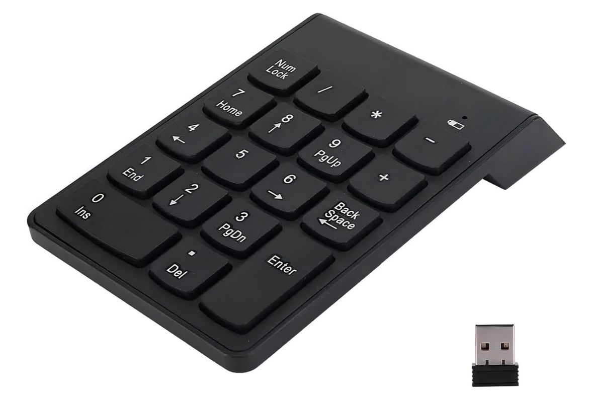 Teclado numérico compacto, inalámbrico, ideal para quienes usan mucho números: contabilidad, facturación, escritorios portátiles o cuando el teclado del laptop no tiene numpad.